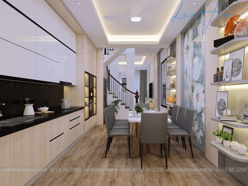 Phòng bếp được ngăn cách với phòng khách bằng cầu thang và tất nhiên, cũng được thiết kế khá tinh tế. Điểm nhấn có lẽ là bức tranh hoa khá to và nổi bật. Nơi đây cho chị Huyền và cả gia đình sẽ có những bữa ăn thật ngon và thật vui!