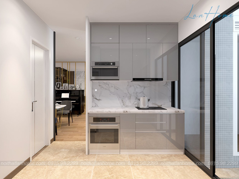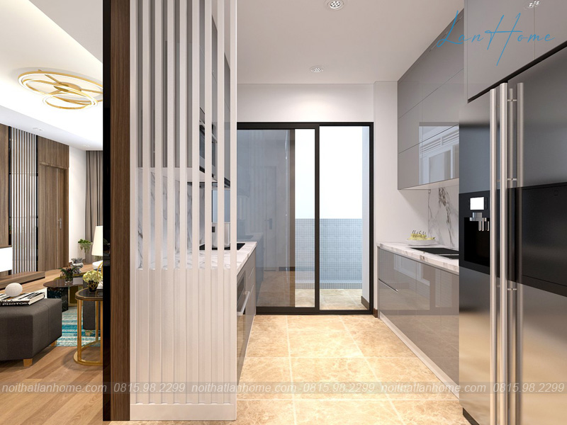 Ngay sau phòng khách là phòng bếp được ngăn cách bởi một bức tường. Phòng bếp có cửa khá thông thoáng, khi nấu ăn có thể mở để mùi thức ăn không quá nồng bên trong nhà. Bếp được bố trí đơn giản, gọn gàng, giúp không gian dường như thêm rộng rãi hơn.