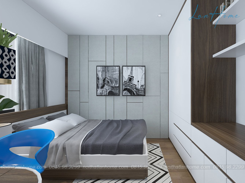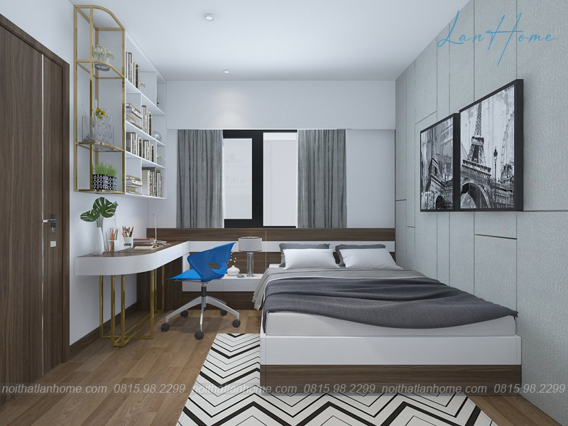 Phòng ngủ nhẹ nhàng, tinh tế với tone màu xám kết hợp màu trắng. Trong phòng còn có cả kệ sách và bàn làm việc, thuận tiện cho những hôm chủ nhân bận rộn, muốn tranh thủ lúc tối hoặc sáng sớm để hoàn thành sớm. Đưa tay kéo chiếc rèm cửa, cả một bầu không khí trong lành ban mai tràn vào, cho một ngày thật rực rỡ và sảng khoái.