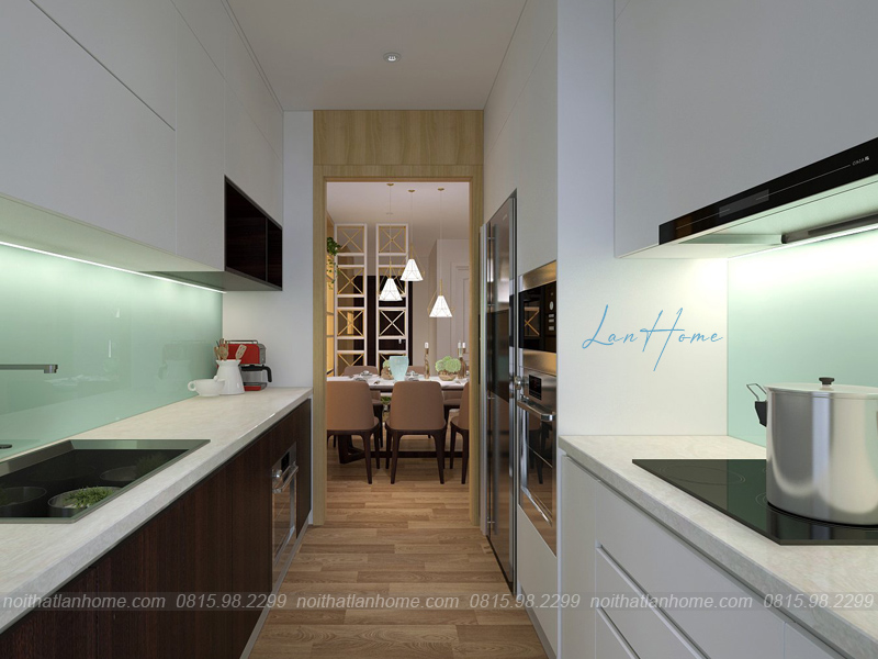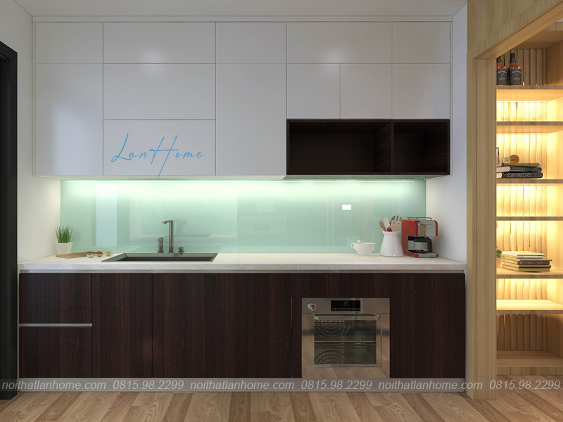 Phòng bếp bố trí khoa học, một bên là bồn rửa bát, một bên là bếp nấu ăn tiện lợi. Đây chính là nơi để chị Lan nhào nặn nên nhiều món ngon cho gia đình. Đây cũng là nơi giữ lửa để hạnh phúc yêu thương thật đong đầy!