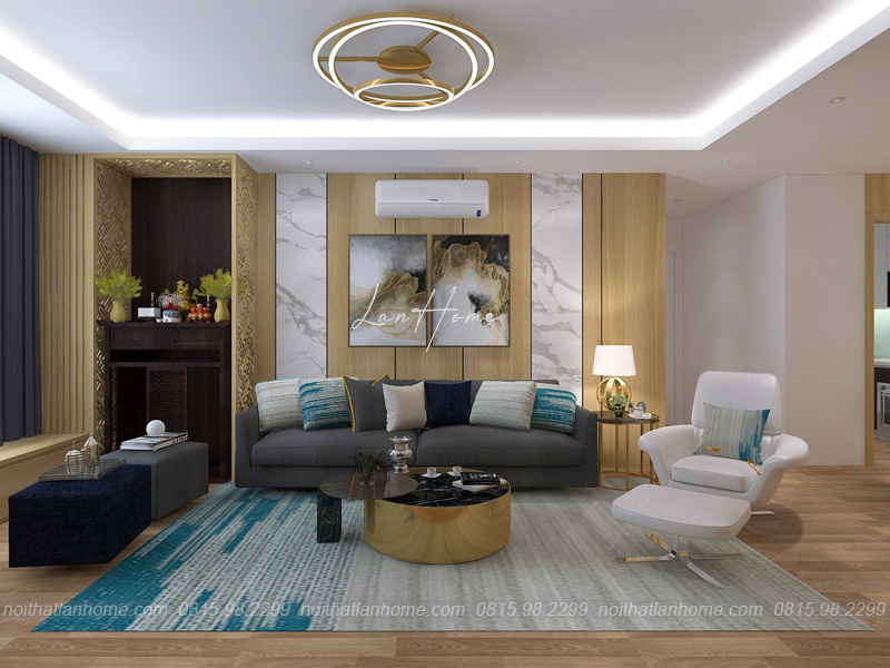 Phòng khách cực ấn tượng với tone màu trắng kết hợp với xanh và ghi đậm. Ghế sofa và thảm kết hợp hài hòa cùng với bức tranh treo tường nổi bật. Vào đây, ai cũng cảm nhận được sự ấm cúng và không khí thân mật, gần gũi. Buổi tối, các thành viên trong gia đình ngồi quây quần, xem chương trình giải trí và kể cho nhau nghe những câu chuyện thường ngày thì thật là hạnh phúc.
